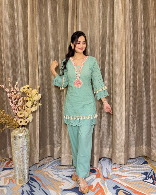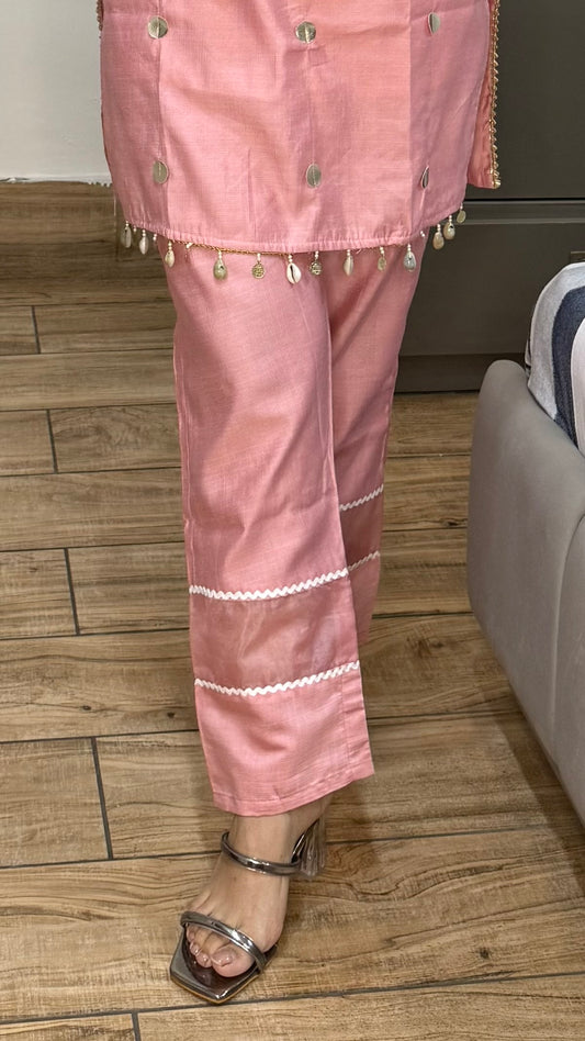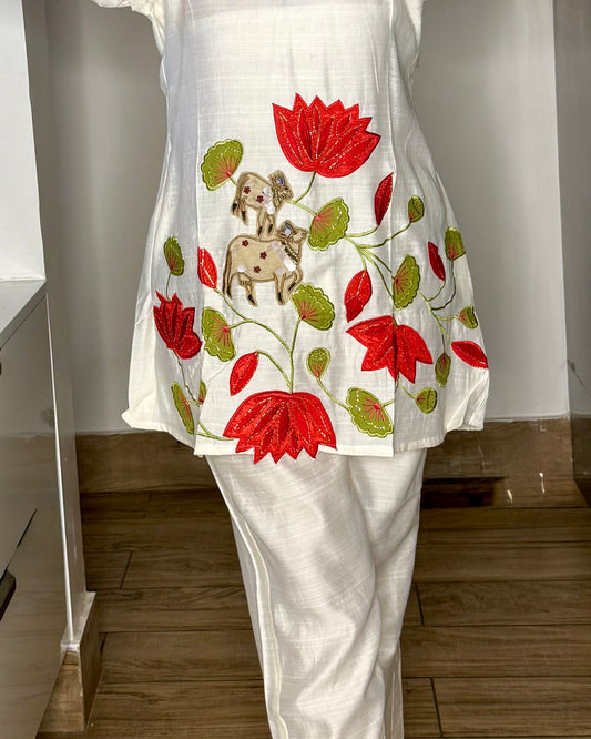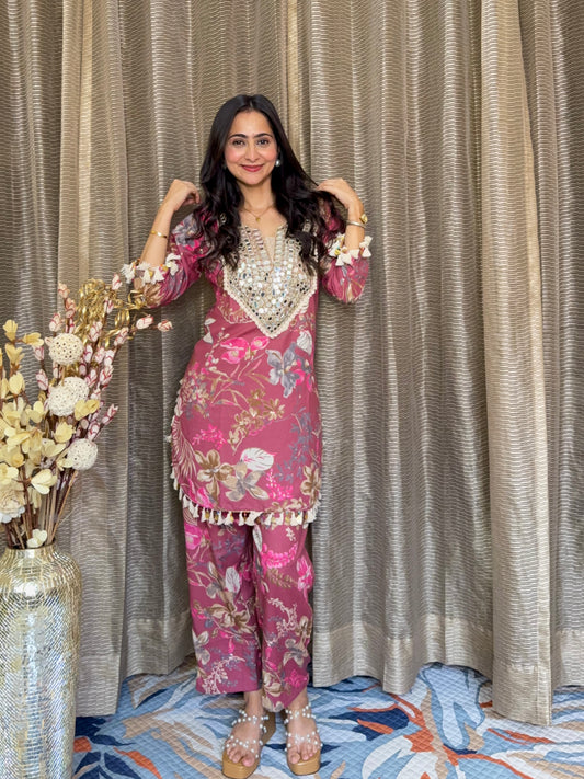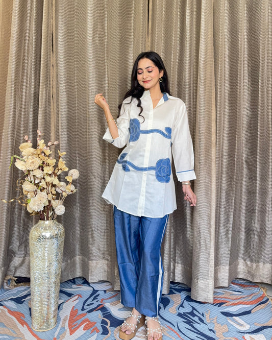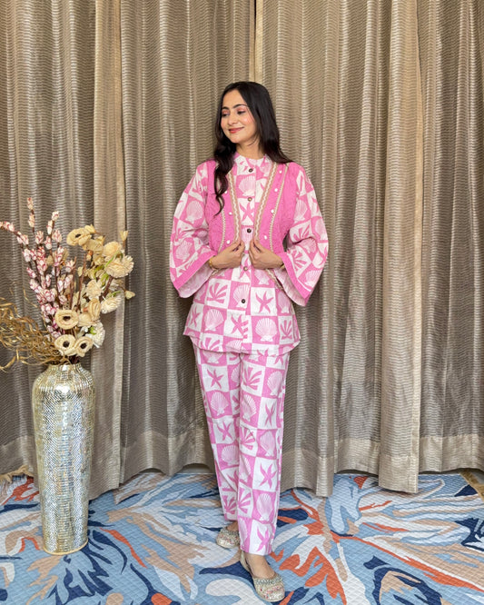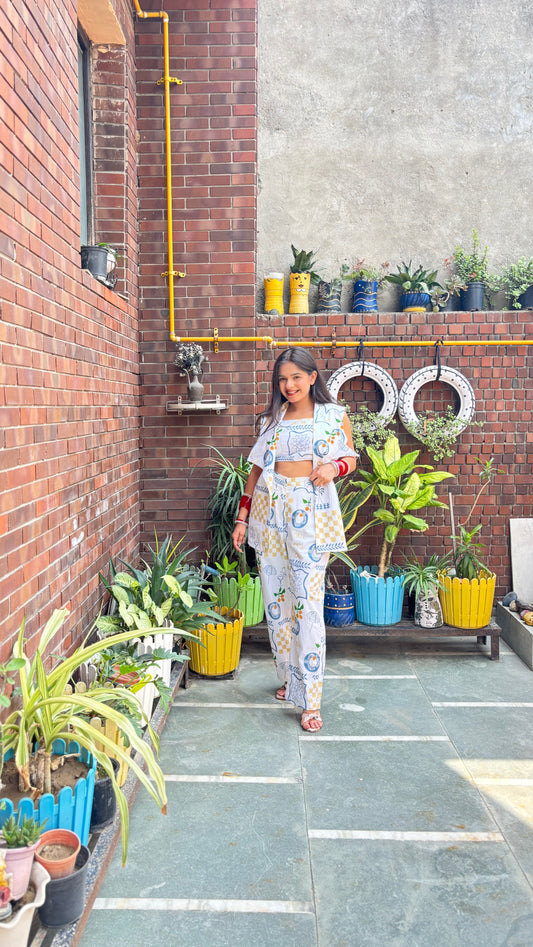 Summer Cool Print Sleeveless Jacket With Crop Top & Straight Pants Co-ord Set